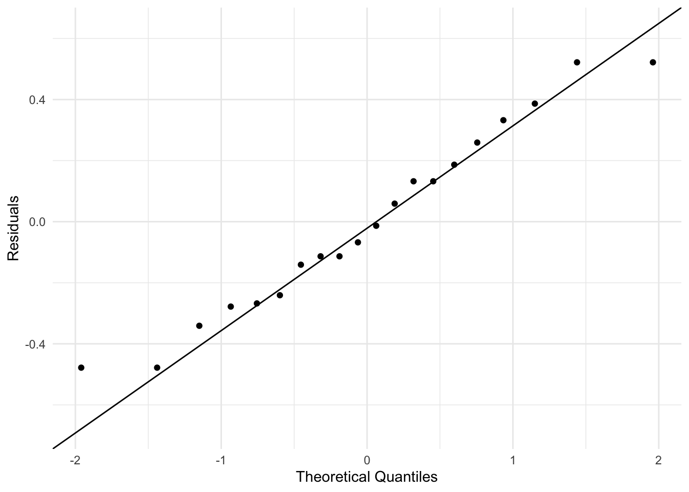 This course does not focus on model diagnostics, but the general idea behind these plots is to evaluate whether our model assumptions are met. The default residuals function accounts for the estimated random effects. These residuals can be regarded as estimates of the observation-level errors \(\varepsilon_{ij}\), which is usually what we want for diagnostics: