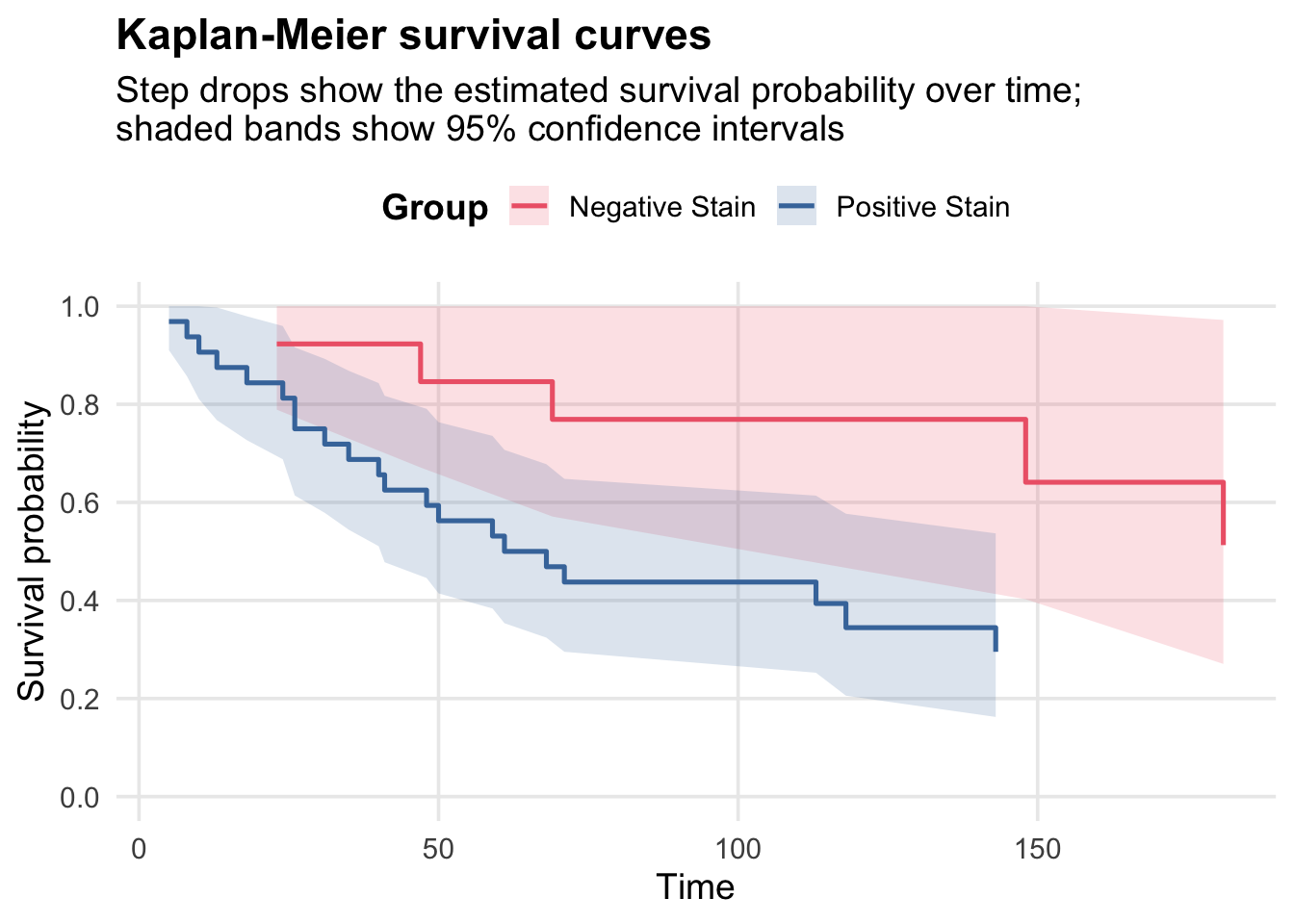 ggplot(km_plot_data, aes(x = time, y = surv, colour = group)) +geom_ribbon(aes(ymin = lower, ymax = upper, fill = group), alpha =0.18, colour =NA) +geom_step(linewidth =0.9) +scale_colour_manual(values = stain_colours, name ="Group") +scale_fill_manual(values = stain_colours, name ="Group") +scale_y_continuous(limits =c(0, 1),breaks =seq(0, 1, 0.2) ) +labs(title ="Kaplan-Meier survival curves",subtitle ="Step drops show the estimated survival probability over time;\nshaded bands show 95% confidence intervals",x ="Time",y ="Survival probability",colour =NULL ) + survival_theme