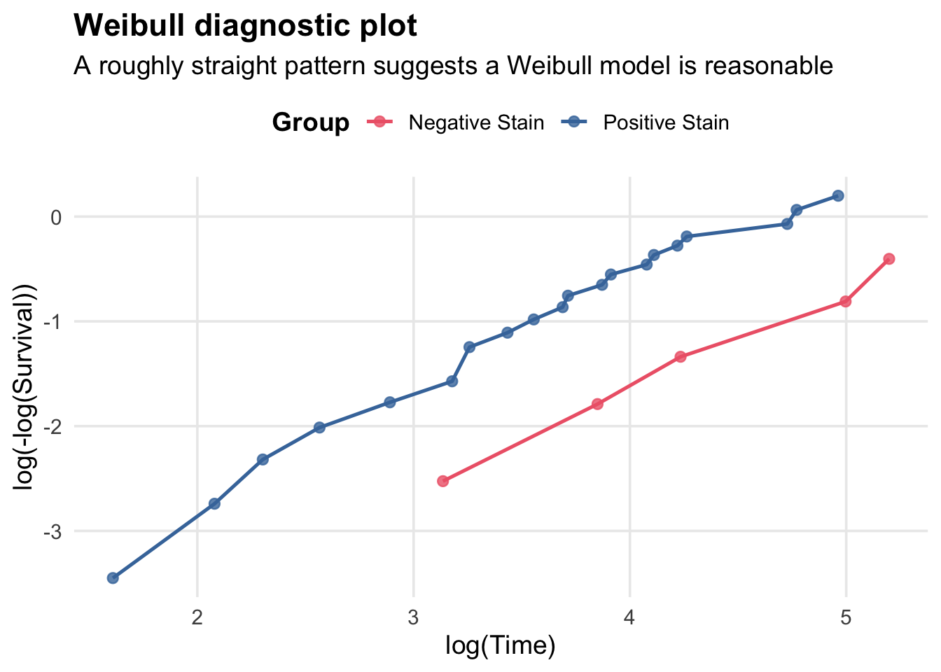 Before fitting parametric models, check if the Weibull distribution is suitable. The log-log transformation of a Weibull survival curve is linear: \[\log(-\log(S(t))) = \alpha \log(\lambda t),\] and so plotting \(\log(-\log(S(t)))\) vs. \(\log(t)\) should yield a straight line if the Weibull model is appropriate.
