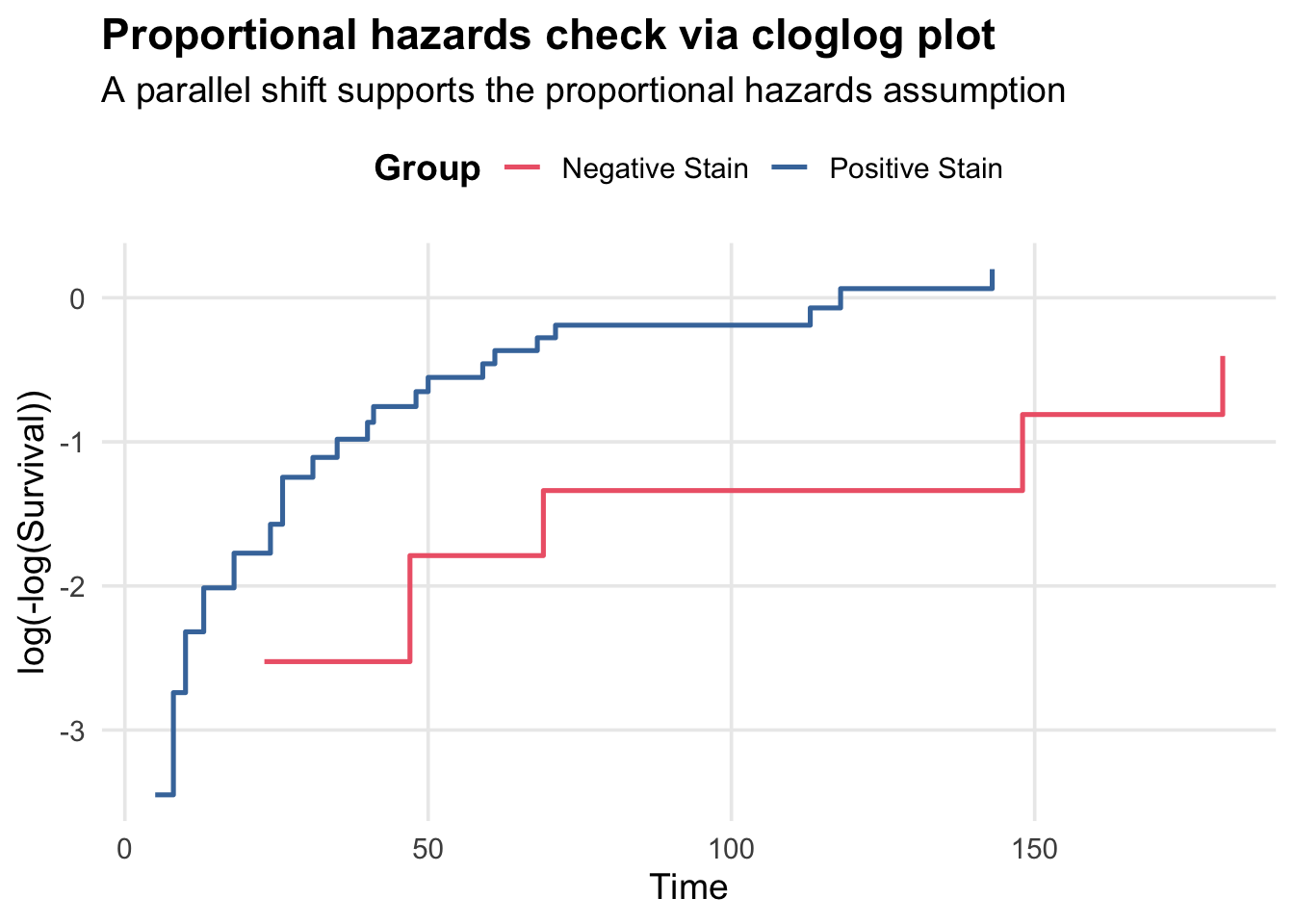 cloglog_plot_data <- km_plot_data |> dplyr::filter(time >0, surv >0) |>mutate(cloglog =log(-log(surv)))ggplot(cloglog_plot_data, aes(x = time, y = cloglog, colour = group)) +geom_step(linewidth =0.9) +scale_colour_manual(values = stain_colours, name ="Group") +labs(title ="Proportional hazards check via cloglog plot",subtitle ="A parallel shift supports the proportional hazards assumption",x ="Time",y ="log(-log(Survival))",colour =NULL ) + survival_theme